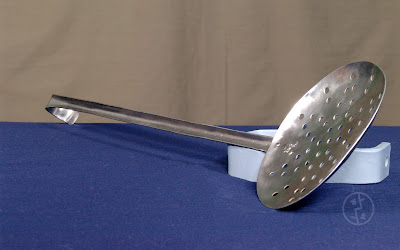 En esta foto vemos una espumadera apoyada sobre un soporte color celeste-gris-claro, Obsequio de Arturo B. Sánchez.
